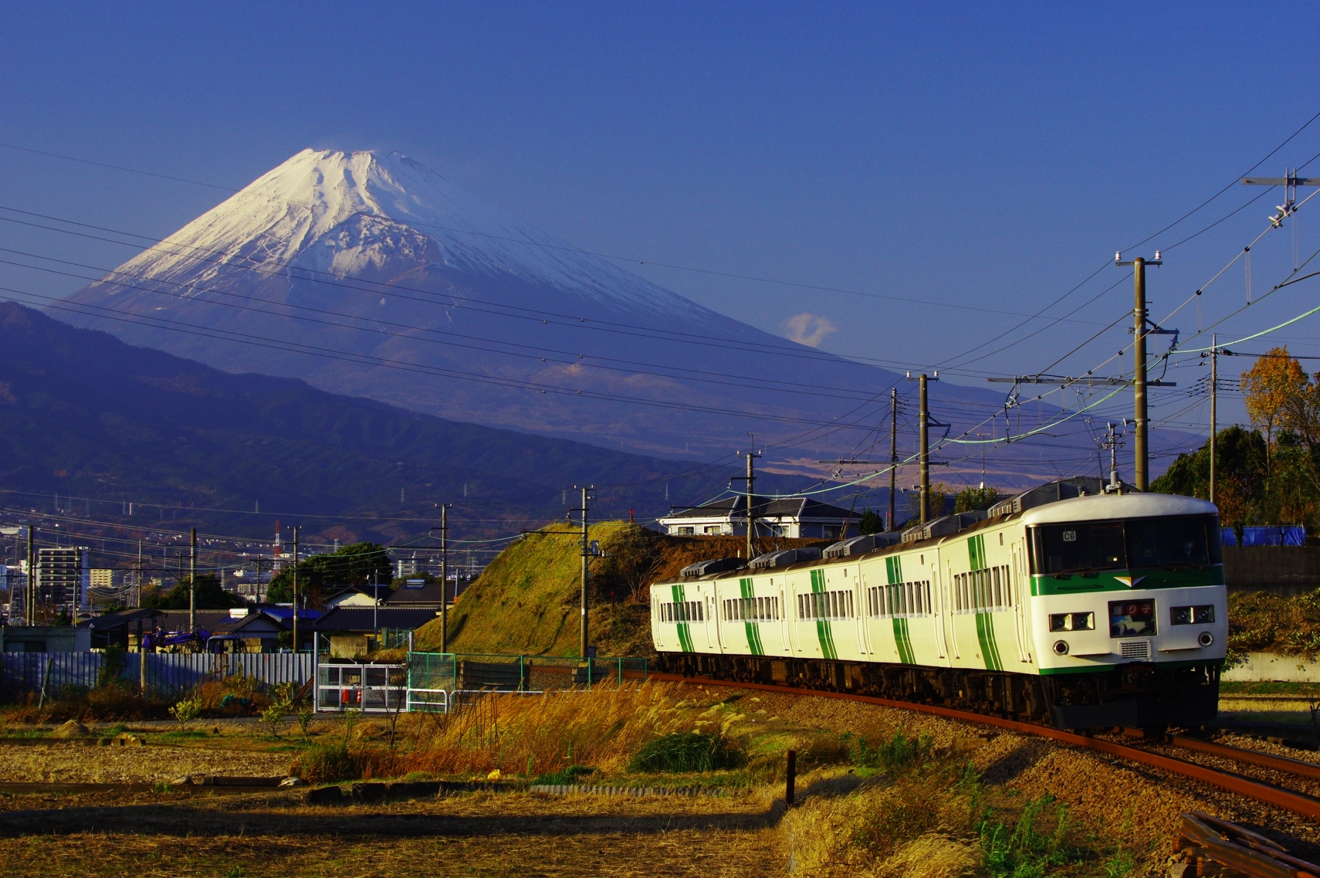 意味:鈍行列車の車窓を満たすようにずっと見えている。五月の爽やかな陽気の富士山だ。