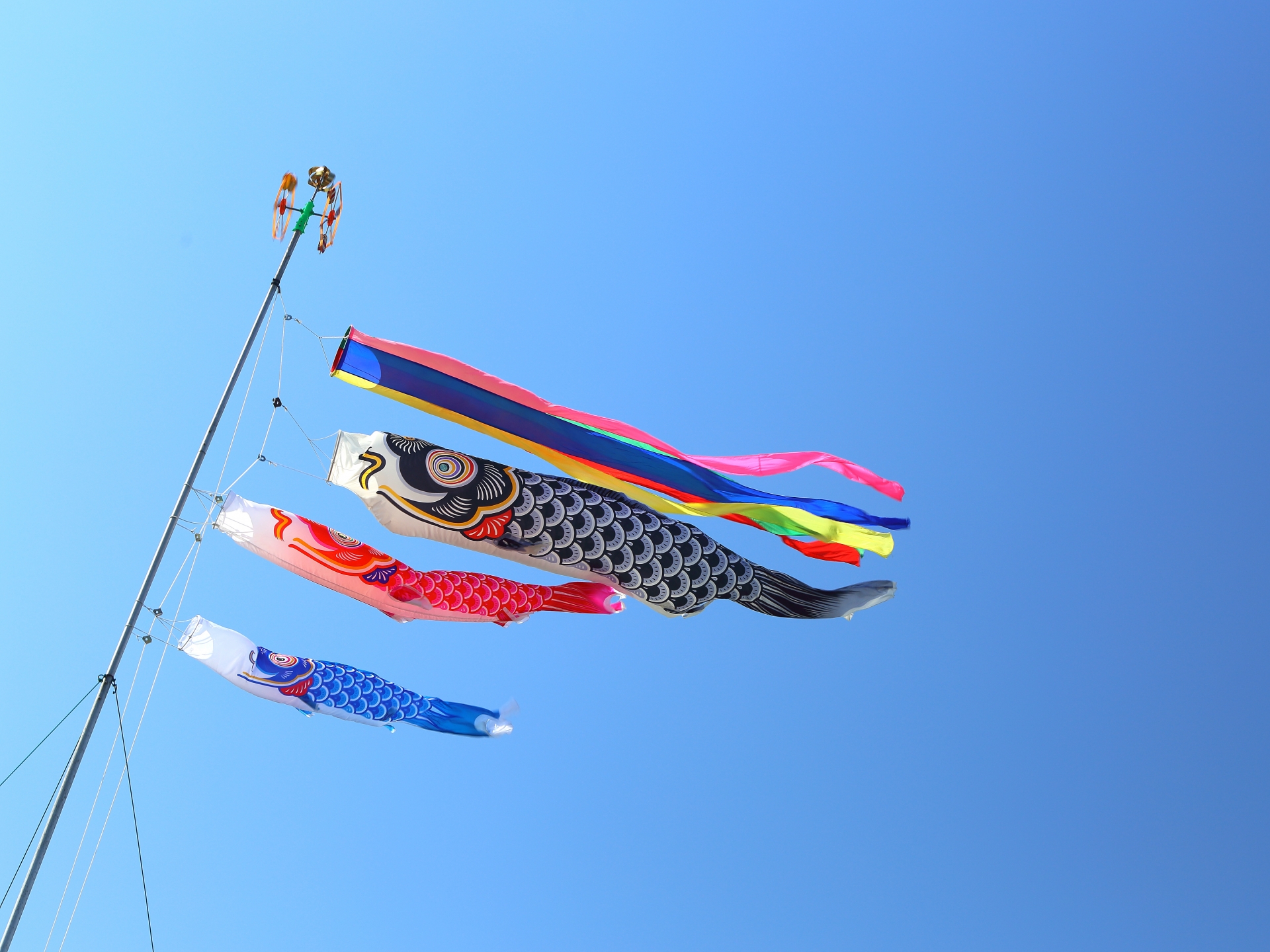 とても気持ちの良い青空が広がる晴天の中で、鯉のぼりが風に乗り自由に泳ぐ姿が想像できます。雄大に泳ぐ鯉のぼりは、見ているこちらも気持ちが良いですね。